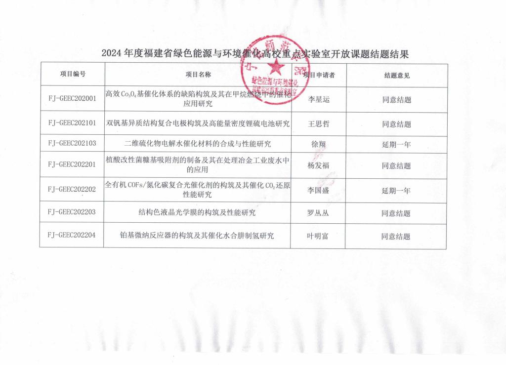 2024年度福建省绿色能源与环境催化高校重点实验室开放课题结题结果